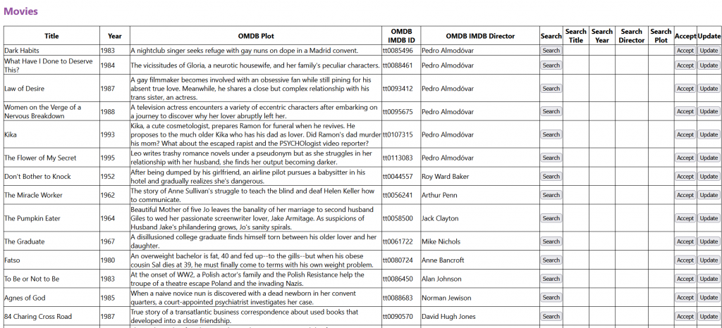 The list of movies began life, as these things are wont to do, as a list in a spreadsheet. In parallel to building the site platform (which I wrote about a year ago), one of the first things I did was tap into the API at https://www.omdbapi.com/, an open database equivalent of IMDB. I built an incredibly crude page that enables me to enter in and search for a movie title, then retrieve the details, save, and modify them. It’s still the mechanism I use to add any new film I acquire, though it’s in fairly strong need of an update, and there are some limitations I’ll address later (in short: description fields are cut off beyond a certain number of characters; multi-entry fields (like actors, directors etc.) are stored in a single comma separated entry, which doesn’t lend itself to being split out and made interactive; you only get one default poster to chose from; it only has about 96% coverage etc.):