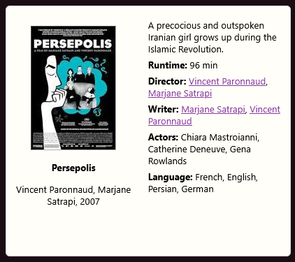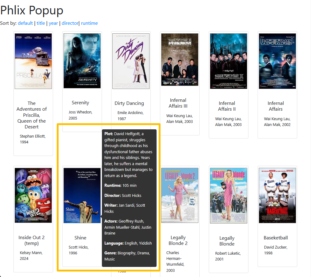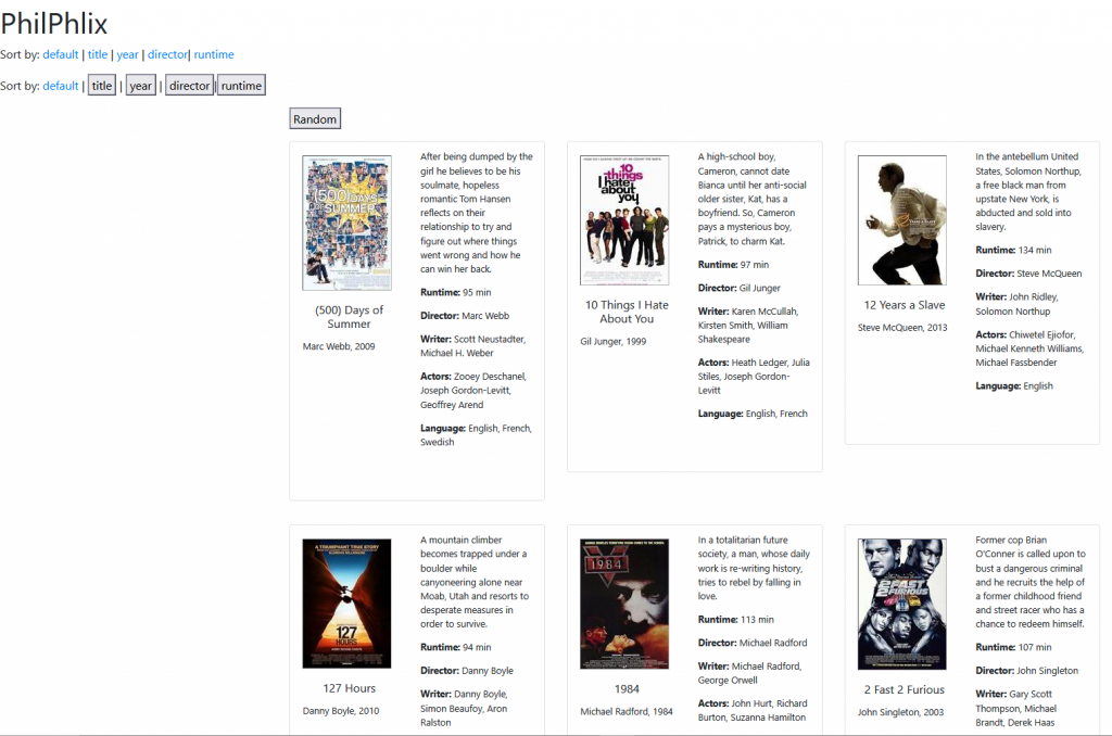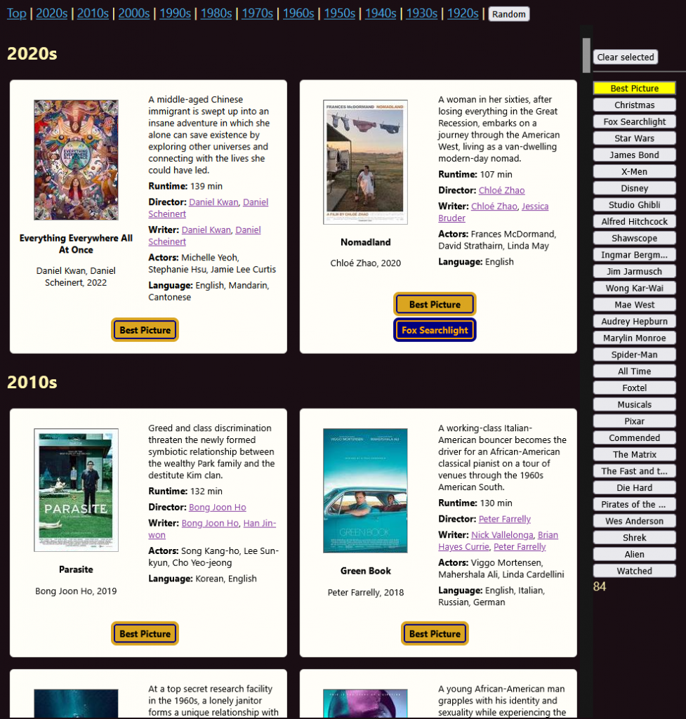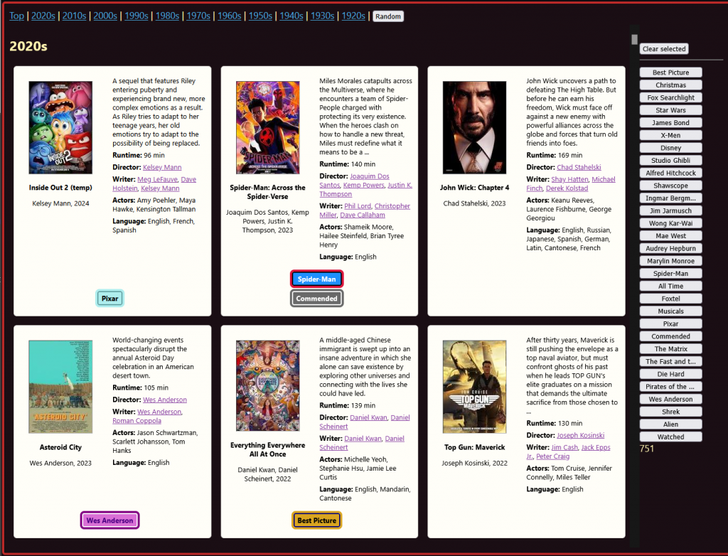 A couple of days ago I uploaded a static version of my WIP movie catalogue at https://philbetts.com/philphlix/philphlix.html – go and have a little looksie.