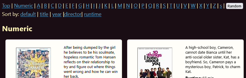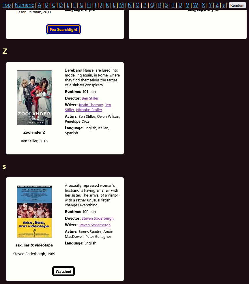 Notice the lower case “s” after the “Z”? That’s because of the 750+ movies I have, one title is stylised with a lower-case letter: Soderbergh’s very important (to me as an indie film scholar) 1989 film sex, lies & videotape. The code I wrote inadvertently distinguishes case and arranges upper before lower. Because sections are generated programatically, we have unanticipated (though logical) behaviour. It’s reasonably trivial to fix, but I’ve left it in for now as it’s a useful reminder to reflect on – this will happen more as we increase complexity.
